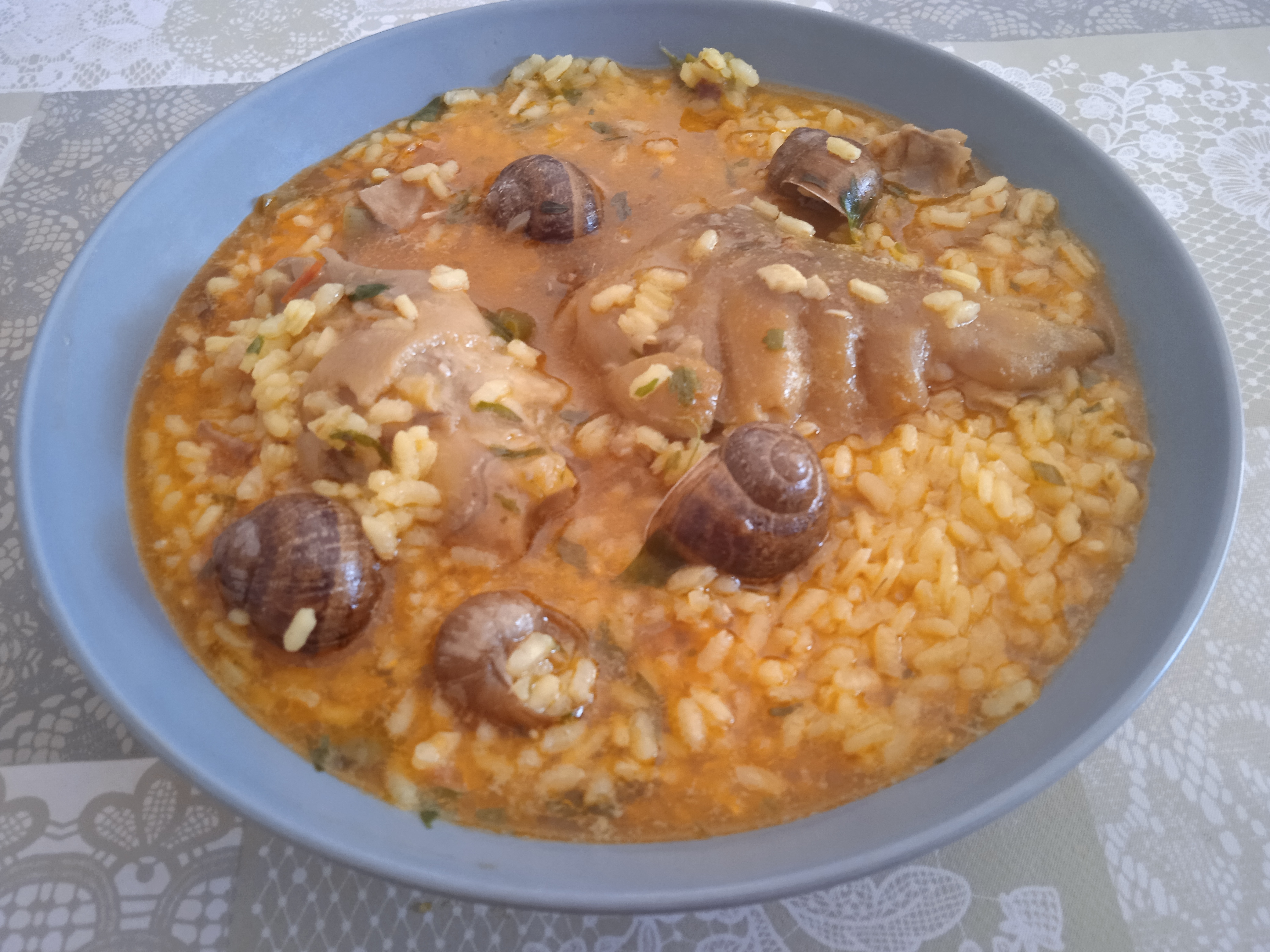 Receta de CarmeloPlato: Arroz con pies de cerdo y caracoles.Cocina: Catalana.
