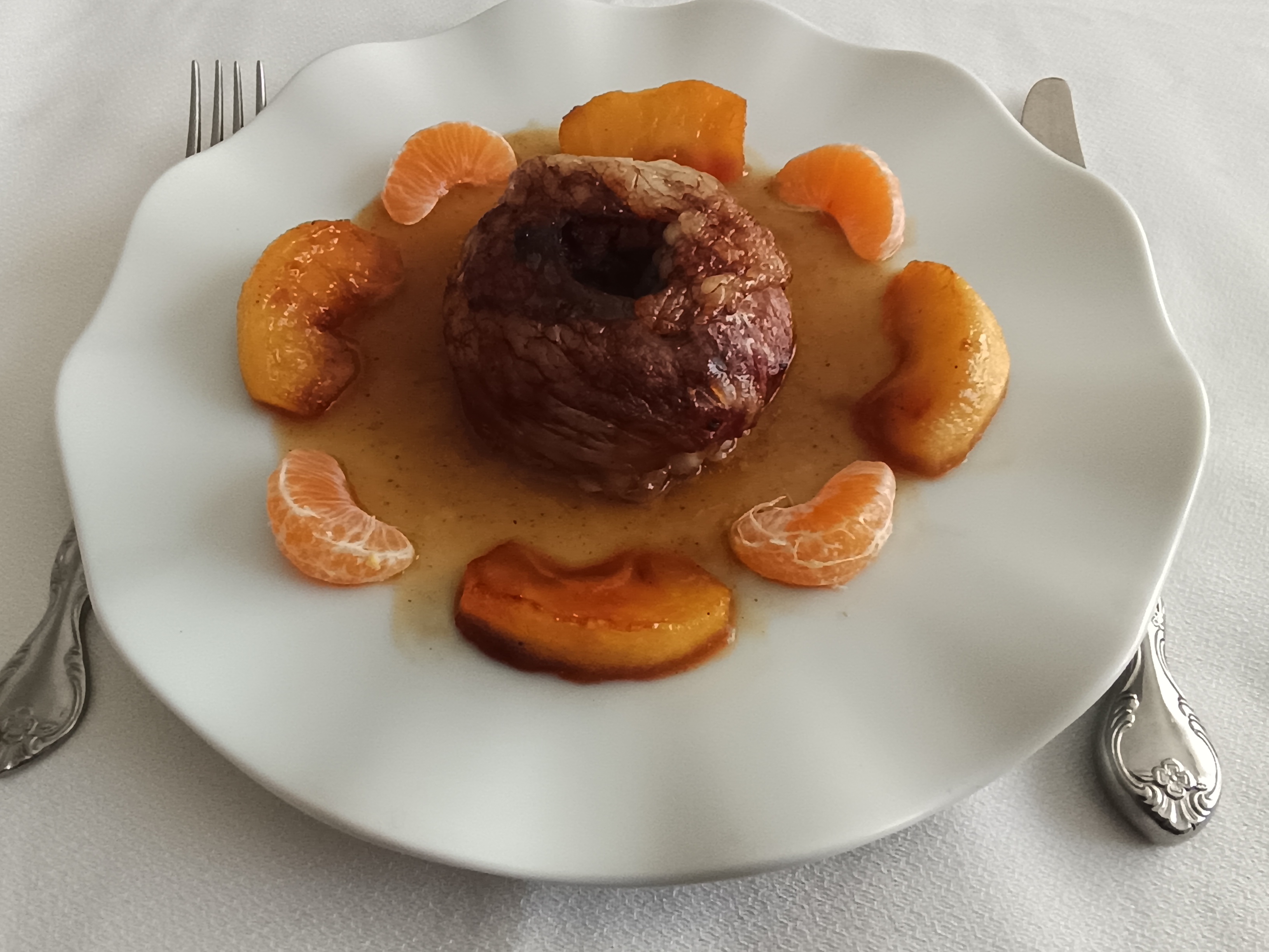 Sobre esto, ponemos la manzana caramelizada, que hemos hecho anteriormente.CORONA DE PATO RELLENA CON SU CARNE Y LA MANZANA CARAMELIZADA.