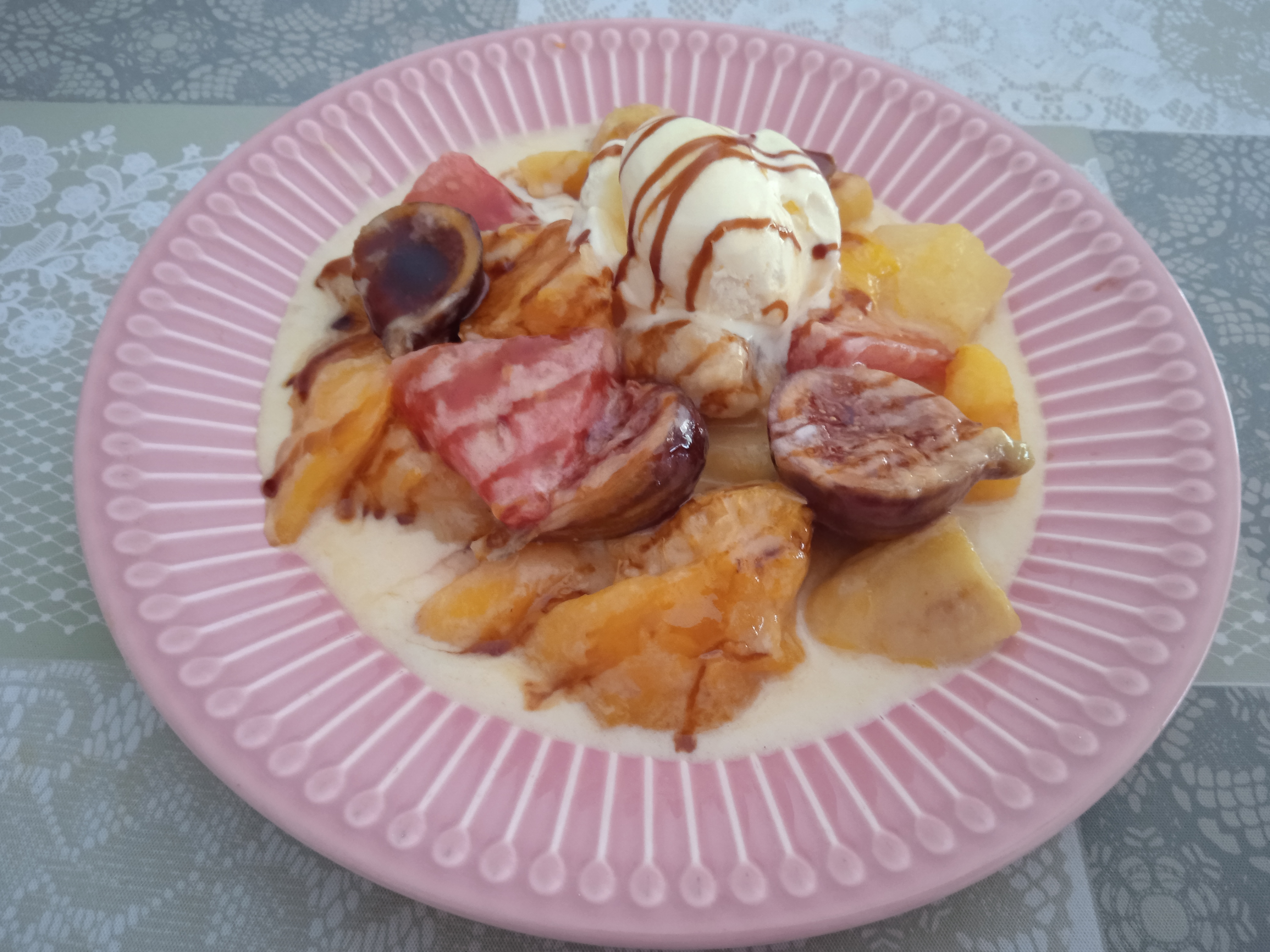 Ensalada de frutas caramelizadas con helado de vainilla. ¿Qué hay más sano que comer, frutas naturales, con sus vitaminas, minerales, fibra y antioxidantes.