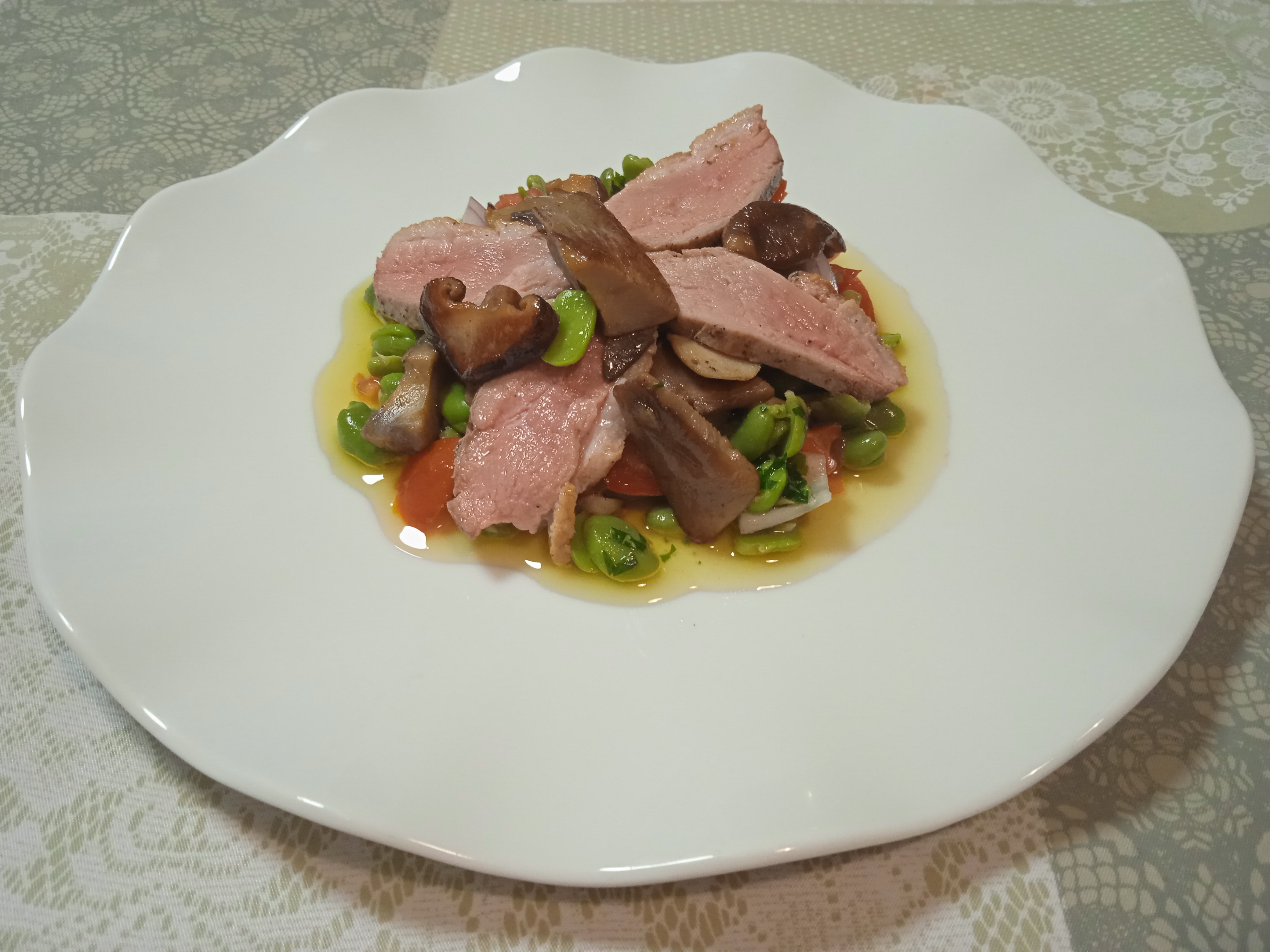ENSALADA DE HABITAS CON MAGRET DE PATO Y SETAS.