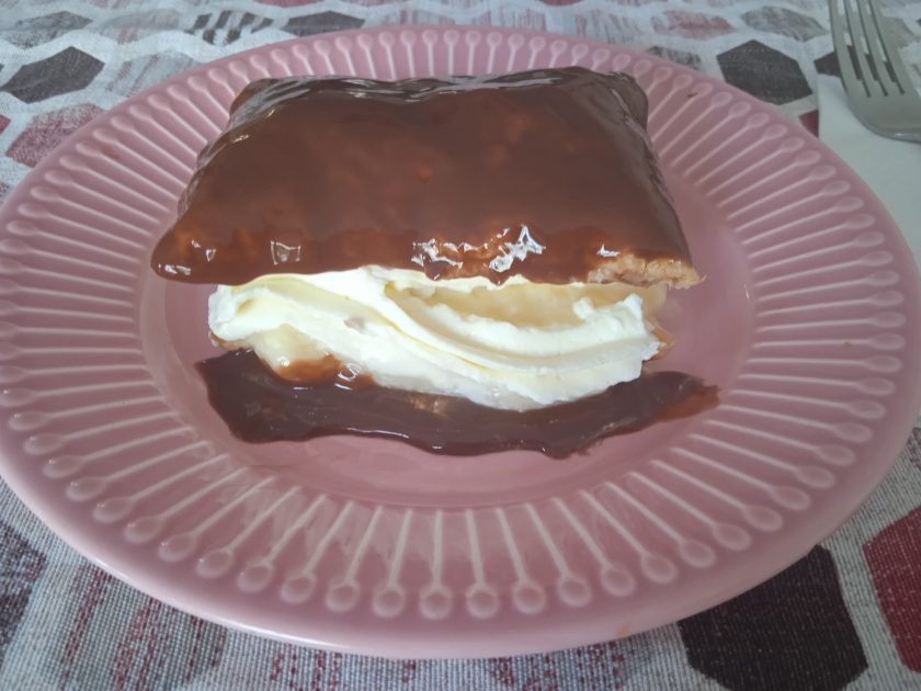 A hacer el hojaldre con crema catalana nata y chocolate.