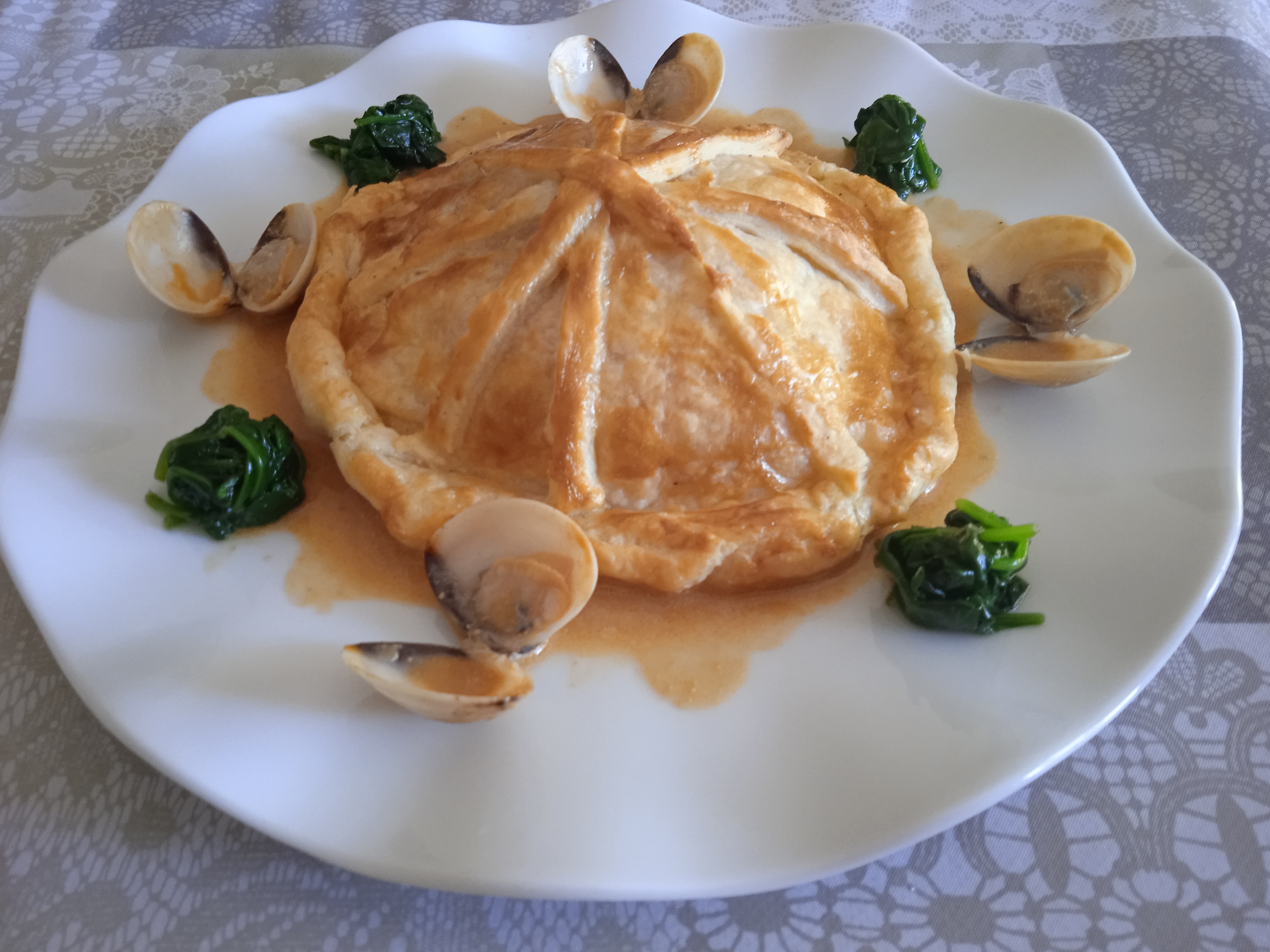 - Cuando pase este tiempo, miramos si el hojaldre está hecho, si es así lo sacamos. Abrimos las almejas y nos vamos a emplatarlo.