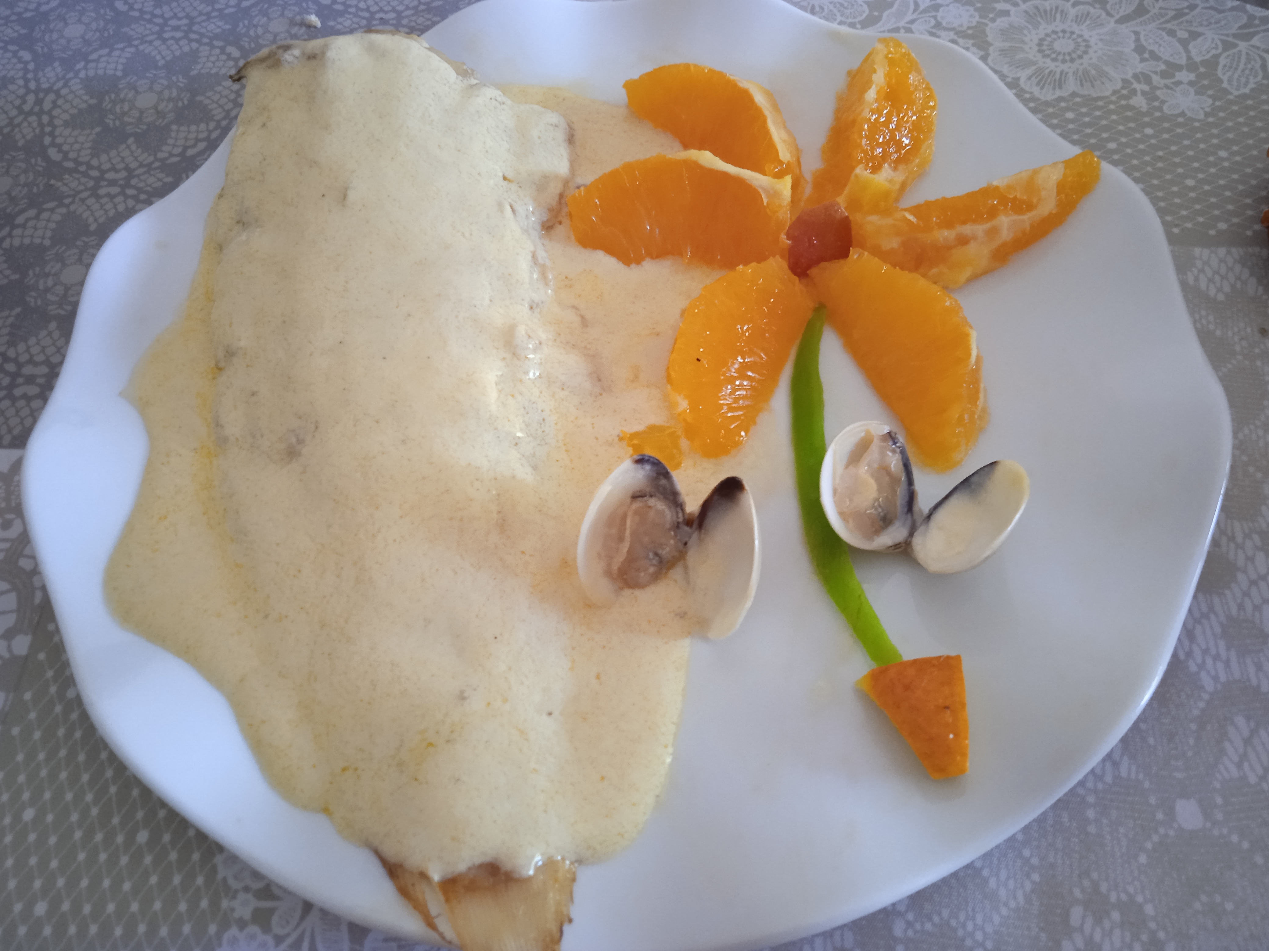- Abrimos las almejas con un poco de agua. Calentamos el lenguado un poco en la salsa de naranja.