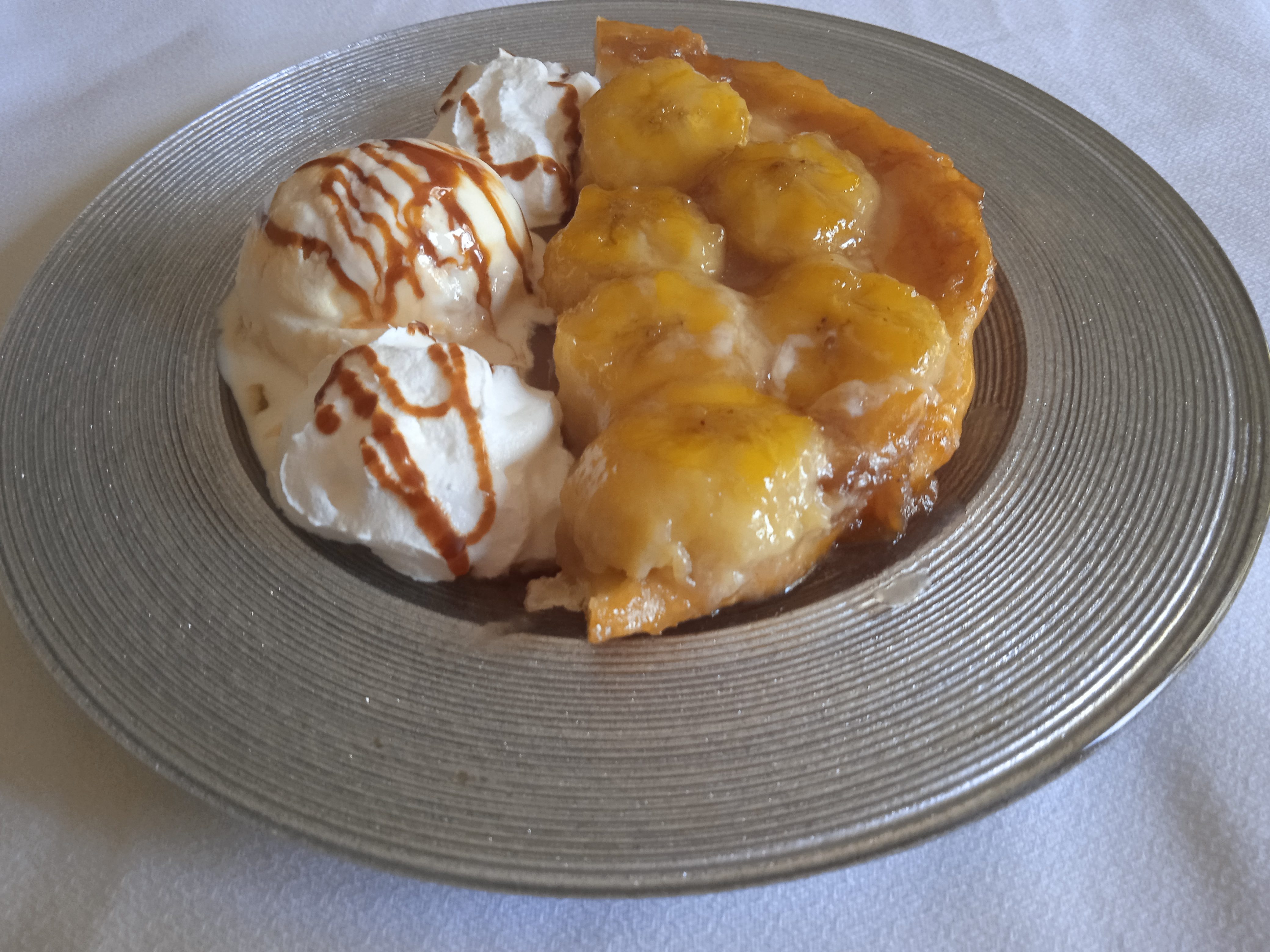 minutosDeliciosa receta de la cocina francesa. Hecha en vez de con manzanas, con plátanos. La cual acompañamos con un helado de vainilla, y dos rosetones de nata montada.